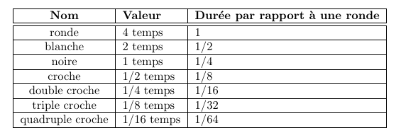 Voici un tableau recensant les différentes durées de notes, avec leurs noms.