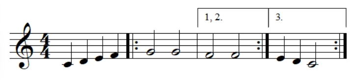 Par convention, les mesures entre les barres de reprises sont jouées deux fois seulement, mais il est possible de préciser une troisième fois.