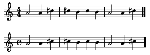 - Dans l'exemple suivant nous avons trois temps durant chacun une noire. La durée de chaque temps d’une mesure simple est toujours une note non pointée.