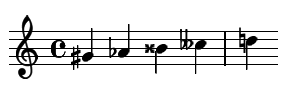 Voici les représentations de ces altérations sur une portée. Dans l’ordre : Sol dièse, La bémol, Si double dièse, Do double bémol, Ré bécarre.